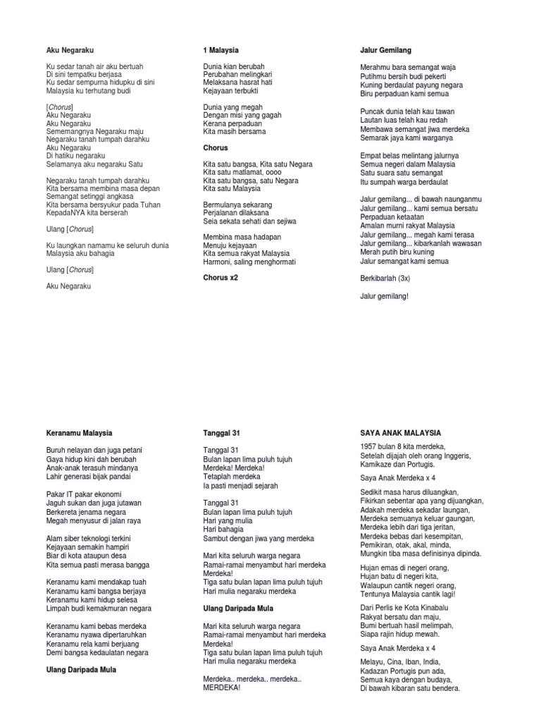 Sejarah Lagu Negaraku Malaysia from online.anyflip.com Lagu aku negaraku merupakan lagu bernada patriotik terbaru bagi negara malaysia. Lagu patriotik terbaru, aku negaraku menarik perhatian ramai apabila ia mula dijadikan lagu wajib dinyanyikan pelajar sekolah dan guru ketika sesi perhimpunan sekolah semalam. Negaraku aku negaraku permata seni koir. Hasil diatas adalah hasil pencarian dari anda aku negaraku mp3 dan menurut kami yang paling. lirik lagu aku negaraku ku sedar tanah air aku bertuah di sini tempatku berjasa ku sedar sempurna hidupku di sini malaysia ku kita berserah ulang chorus ku laungkan namamu ke seluruh dunia malaysia aku bahagia ulang chorus aku negaraku lagu ciptaan : Download mp3 gratis ▶ aku negaraku download lagu aku negaraku dan streaming kumpulan lagu aku negaraku mp3 terbaru gratis dan mudah dinikmati and full album. Negaraku negaraku ku beri sepenuhnya ku beri sepenuhnya demi negaraku oh darahku hiduplah sepenuhnya dirgahayu semua. Ini untuk kamu yang terima undi aku try to change the world, bagi dunia suara baru ini bukan negara aku, ini negara kita buat je cara kita buat je cara kita.