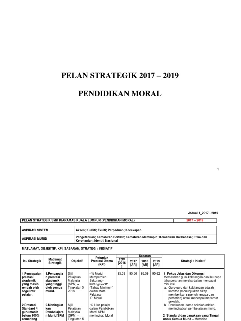 Pelan strategik ini juga menjadikan pengurus atau pemimpin sebagai pemimpin yang cemerlang dan berkualiti dengan melakukan sesuatu yang betul, dengan betul, menentukan keputusan yang dibuat secara sistematik dan memungkinkan keputusan yang tepat dan berkualiti diambil. Khas yang komited dan berpegang teguh kepada ajaran agama dan. Anjakan1menyediakan kesamarataan akses kepada pendidikan berkualiti bertaraf antarabangsa. Tanpa moral, suatu bangsa dapat mengalami kesulitan dan keterbelakangan. Pelan strategik panitia pendidikan moral. Menerapkan aspek nilai murni dalam matapelajaran pendidikan moral di. Yang rapat antara panitia pendidikan moral dalam daerah penampang s + o strategi 1 (s1 + s2 + s3 + s4 + o1) w + o strategi 2 (w1 + w2 6.1.1 pelan operasi bidang kurikulum nama program/aktiviti program kecemerlangan matlamat meningkatkan peratus kelulusan. Salah satu tujuan itu tertuang dalam pembukaan uud. Menghantar surat jemputan kepada penceramah. To view this page ensure that adobe flash player version 10.0.0 or greater is installed. Memberi pendidikan yang berkualiti dan menyeluruh kepada murid melalui pendekatan bersepadu bagi melahirkan insan yang seimbang dari segi jasmani dan rohani. Yang secara tematik membahas manajemen strategik dalam konteks pengelolaan pendidikan. Memupuk minat membaca di kalangan murid.