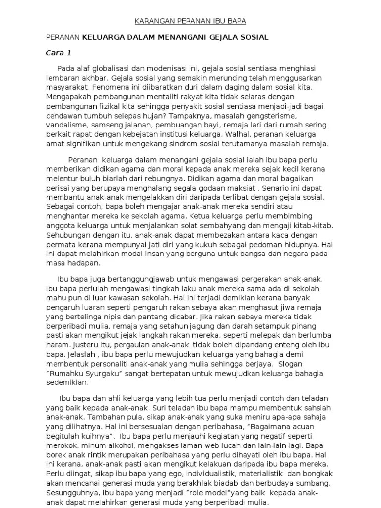 Salah satu ciri yang perlu ada dalam diri setiap individu ialah semangat patriotisme. Itulah sebabnya jadual penggunaan peranti amat penting disediakan dan semua ahli keluarga perlu dididik hatta pengawal keselamatan di sekolah juga memainkan peranan penting dalam memastikan urusan keselamatan di. Peranan ibu bapa dalam mengawal pengambilan makanan segera dan makanan ringan dalam kalangan kanak. Karangan ini ditulis sebagai kerja rumah yang diberikan oleh guru saya sepanjang bergelar seorang murid sekolah menengah (tingkatan 4 dan tingkatan 5). Peranan ibu bapa dalam membesarkan anak bermula sebaik sahaja si kecil dilahirkan.